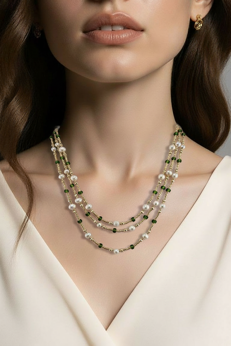 Collier en perles de culture rose entrelacées de perles plaqué or d 'une longueur de 38 cms sans le fermoir et la chaînette de 3 cms en plaqué or 18k.
